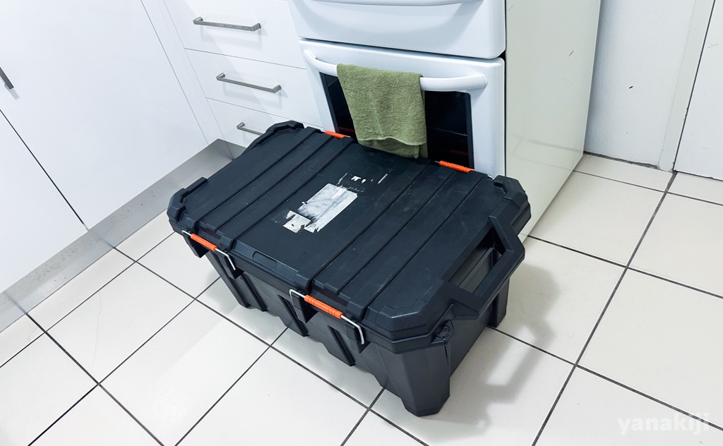 到着して部屋に入った瞬間、レンタル予約していたキャンプ用品が入った黒いボックスがドンと置かれていました!問題なく届くかがすごく心配だったので、ホッとひと安心…。