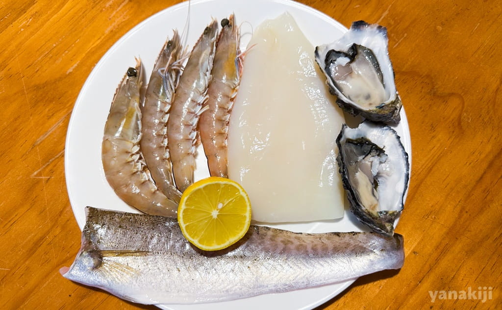 買ったのは、エビ、イカ、キス、牡蠣。