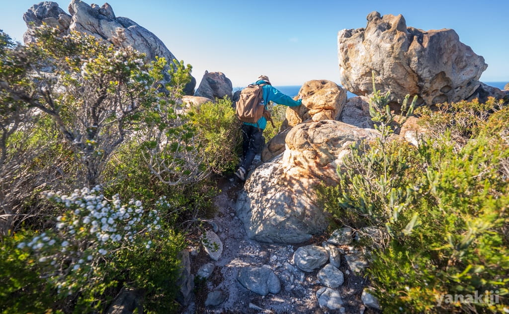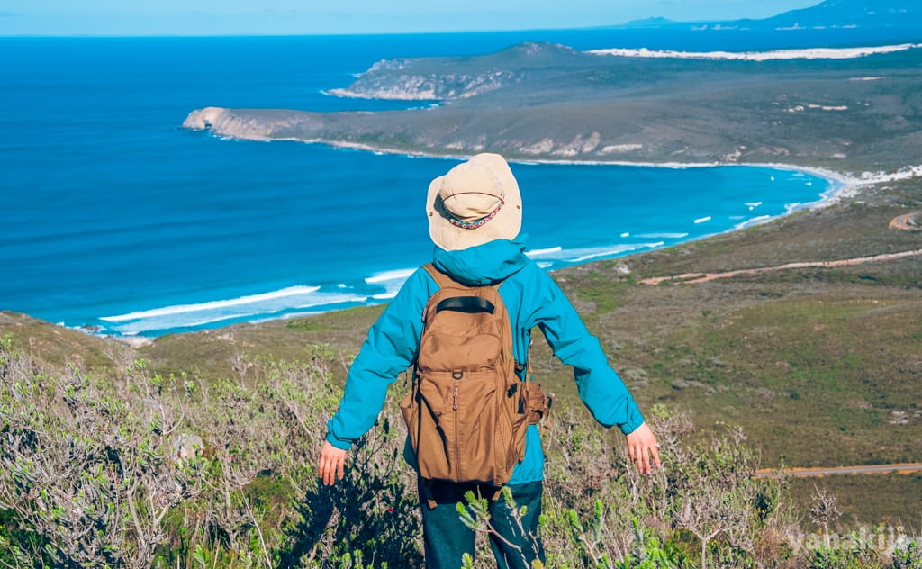 途中から岩がゴロゴロ増えてきて、だんだん勾配も強めに。高台のてっぺんらしき場所に着いた時点でも、すでに十分すぎるビューポイント。オーストラリアの端っこらしく、地平線がどこまでも続いて見えて、遠い世界へ視線が伸びていく感じがします。南へ広がる海の向こうを想像すると、気持ちがふっと高揚しました。