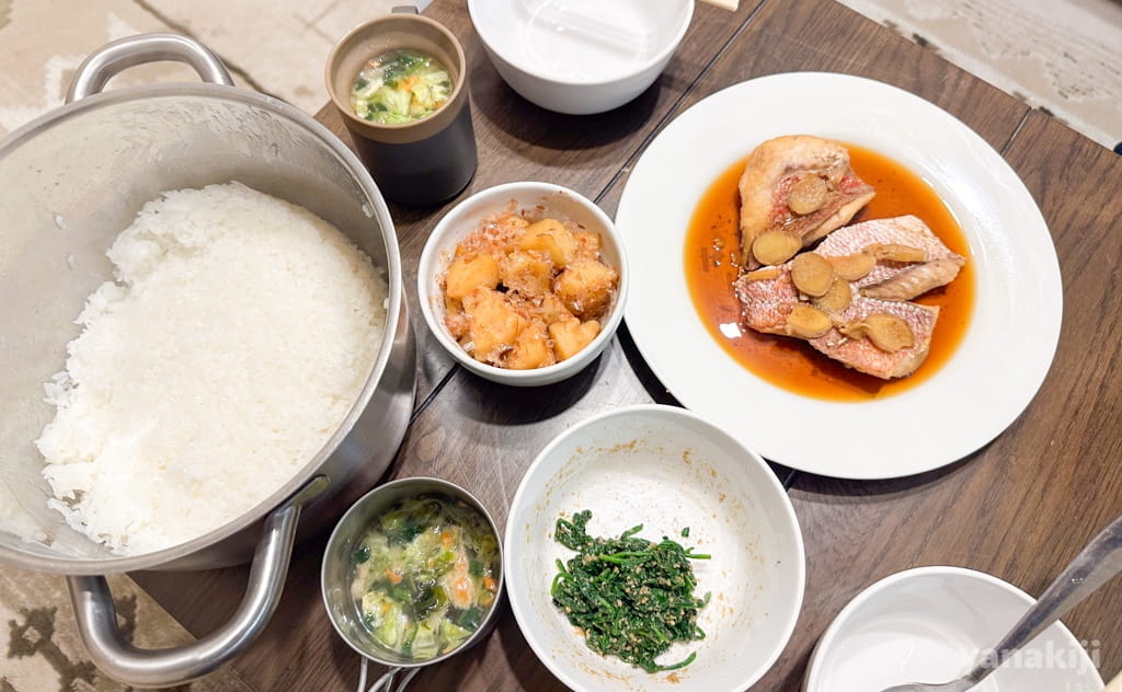 この日のメニューは、鯛の煮付け、おかかポテト、ほうれん草の胡麻和え、お味噌汁、白米。完全に日本の家庭の夜ごはん。