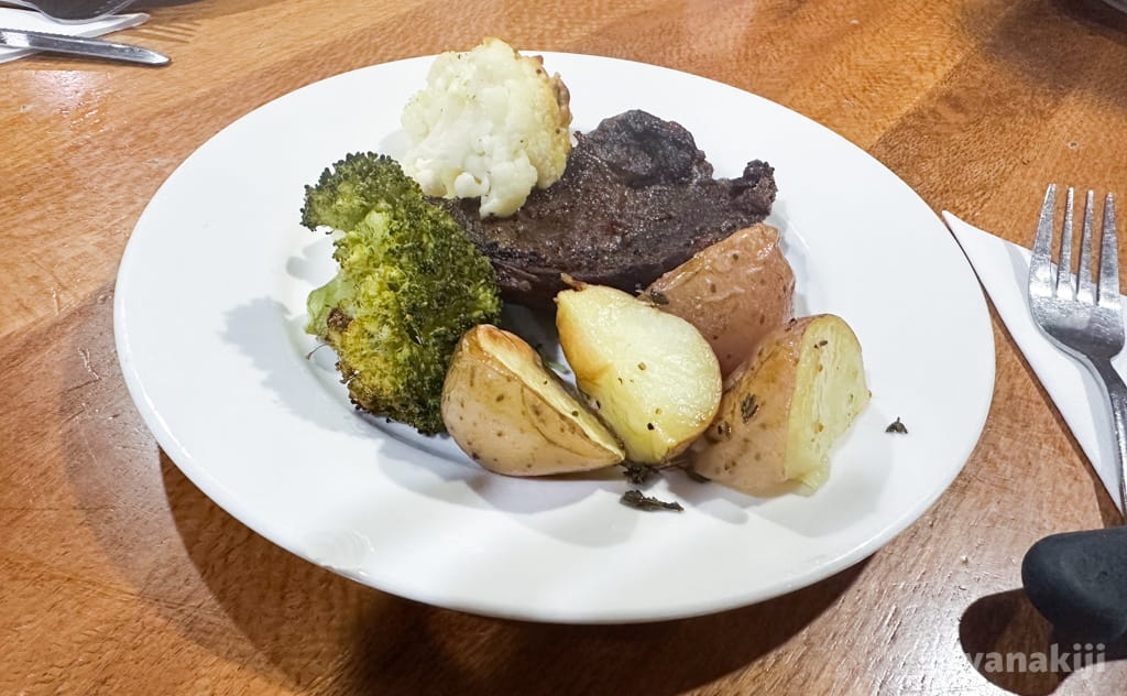 ダイニングスペースには、定員人数である48名が一斉に着席できるほどの広さがあって、みんなで同じタイミングでいただきます。朝食はビュッフェスタイルだそうですが、夕食はみんな同じメニューでした。後から調べたところ、ベジタリアン用のメニューも対応してくれるそう。