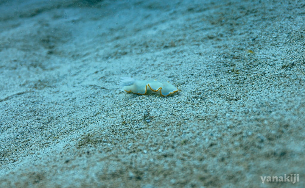 砂の上を這う生き物も発見。この子は「メレンゲウミウシ」といって、黄色く縁取られた体をヒラヒラと動かしながら移動するのが特徴です。その白く清楚な見た目から「メレンゲ」という名が付いたと言われています。
