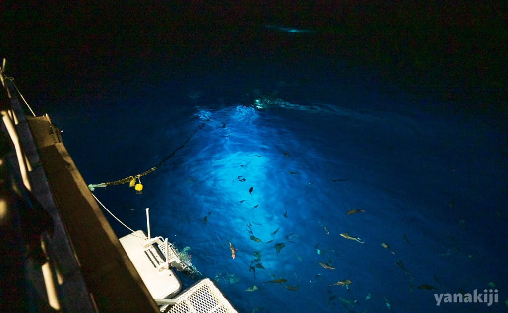 水中ライトを持って泳いでいるため、船の上からでもぼんやり動きが見えます。「結構遠くまで行くんだ…」「あ!何か発見したな?」と想像しながら眺めるのも、これはこれで楽しい時間でした。