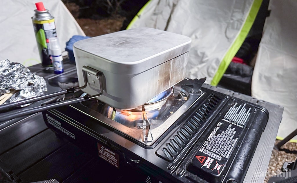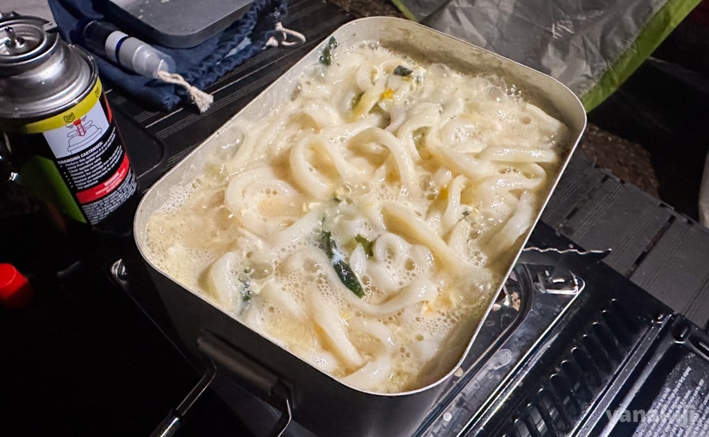 セスナの大満足フライトを終えてテントサイトへ戻り、夜ごはんはうどんと照り焼きチキン。疲れきった体に沁みる沁みる…。