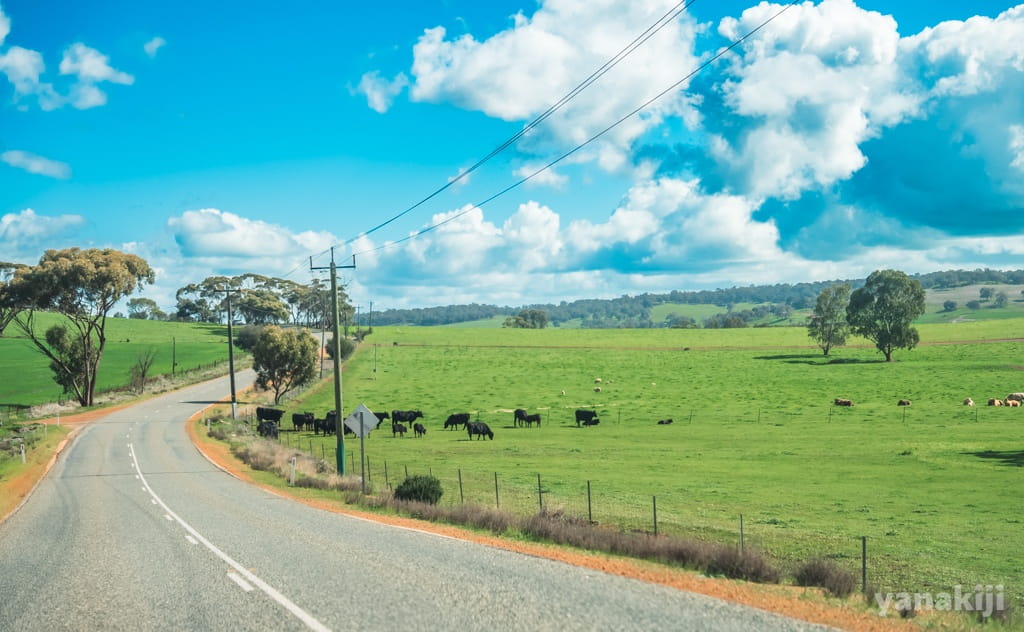 このあたりは畑や草原が多くて、内陸の乾いた景色よりも緑の彩度が高い。木の背も高めで、視界がやわらかい。パースの北側へ向かう道は、とにかくのどかだった。