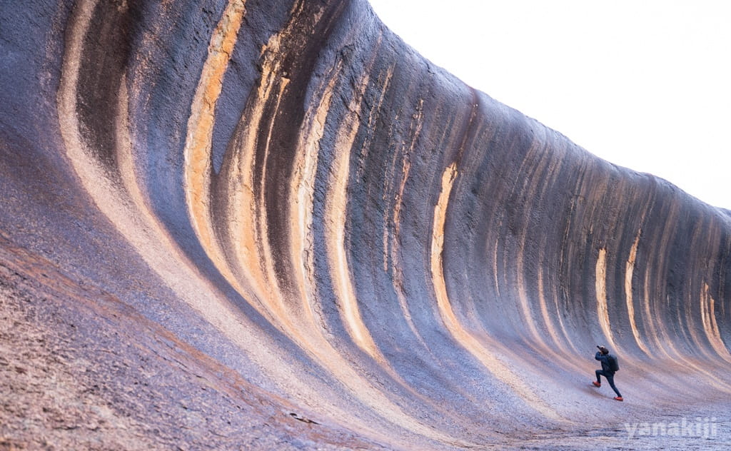 朝イチの目的地はウェーブ・ロック。巨大な花崗岩の崖が、まるで波が盛り上がった瞬間みたいにうねっている場所で、全長はおよそ110mとも言われるスケール感が圧倒的だ。