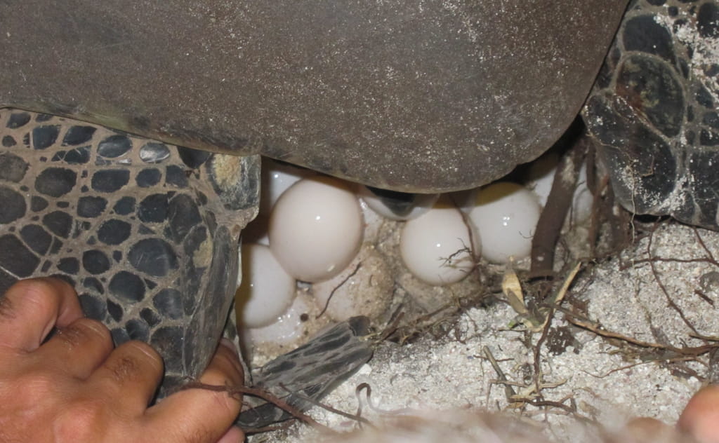夜の闇の中、母ウミガメは海岸を這って進み、後ろ足を器用に使って深さ50〜70cmほどの穴を掘ります。そこで約30分かけて、ツヤツヤした白い卵を約100個産卵。産んだ後は砂でしっかり隠して、海に戻っていきます。