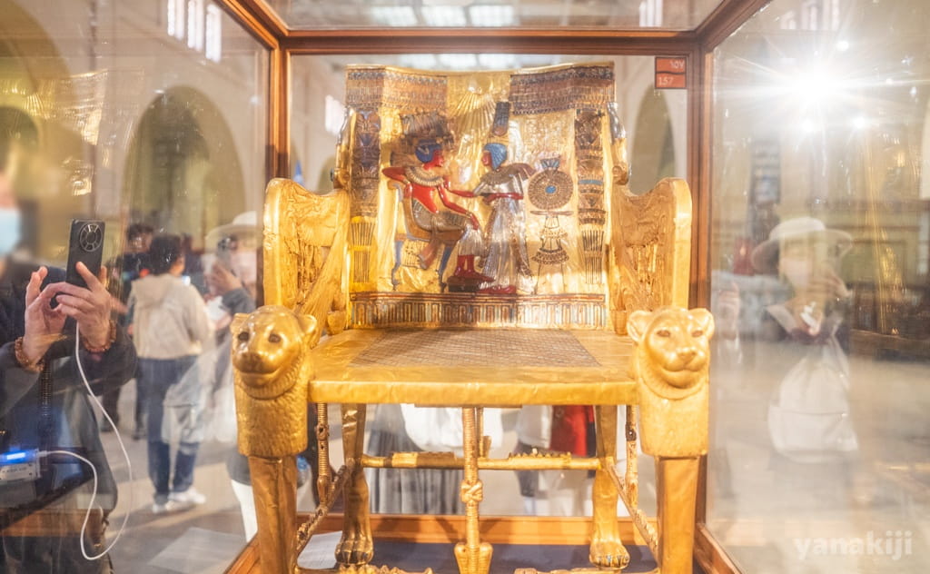 墓の中から見つかった「黄金の玉座(椅子)」の背もたれには、仲睦まじい二人の姿が描かれている。アンケセナーメンが夫の体に香油を塗っている、日常の何気ない、けれど愛に満ちた場面。