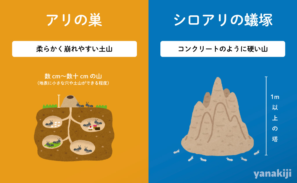 アリの巣とシロアリの蟻塚、それぞれの主な特徴は上図の通り。ただし、シロアリならどれでも大きな蟻塚を築くわけではありません。